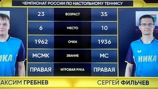 Максим Гребнев (МСМК. ФНТР: 1962. RTTF: 1251) vs Сергей Фильчев (МС. ФНТР: 1936. RTTF: 1150)