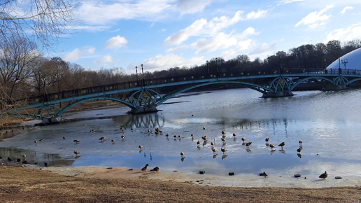 "Огари с утками" на земле и на пруду возле "Екатерининского острова" и мостов в парке Царицыно в Москве