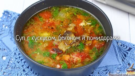 Очень вкусный и сытный. Суп с кускусом, беконом и помидорами