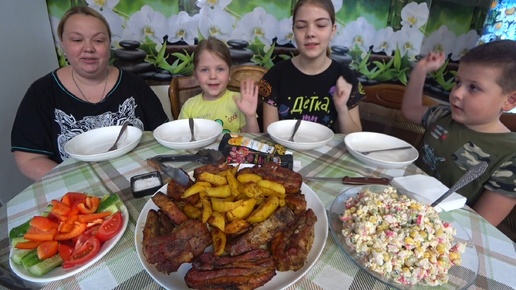 Мукбанг. Свиные рёбрышки барбекю, крабовый салат и картофель по деревенски
