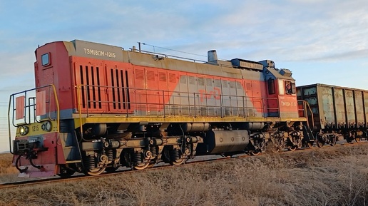 Тепловоз ТЭМ18ДМ-1215 с полувагонами на подъездных путях к кирпичному заводу № 1.