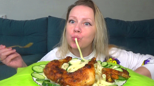 Мукбанг макароны с кетчупом как в детстве, курочка запеченная в духовке. еда.