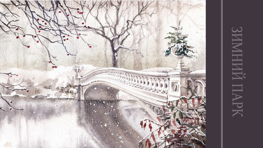 Зимний парк акварелью.Мост через реку| Ускоренный МК