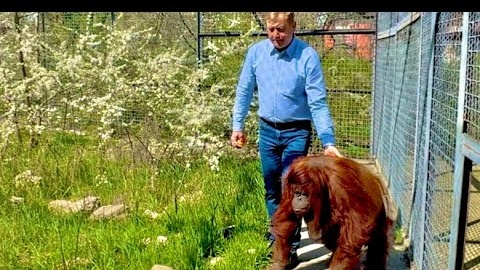 Дана после болезни вышла в вольер,но огромный орангутан соглашается идти только рядом с Зубковым!