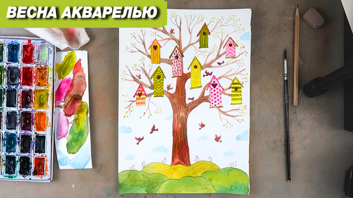 Как нарисовать дерево и скворечники, рисуем весну акварелью