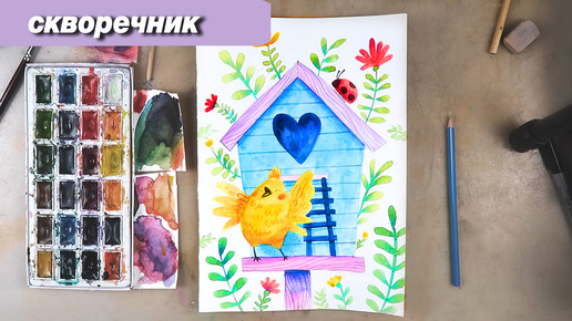 Как нарисовать скворечник и птичку акварелью