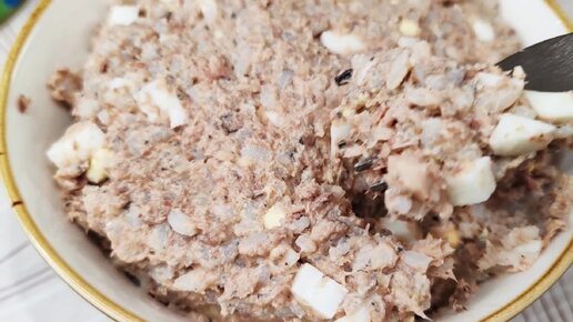 Салат с рыбными консервами, рисом и яйцами