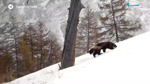 росомаха с любопытством вынюхивает полянку