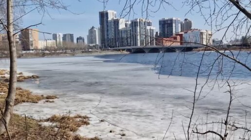 Река Исеть в центре Екатеринбурга в конце марта Тает лед Утки Рыбаки на льду Мой пикник на пне вместе с воронами и белкой