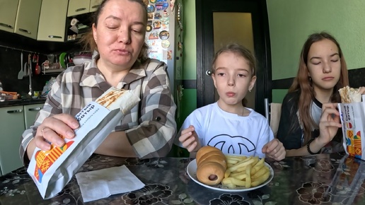 Мукбанг, шаура, картошка фри и сосиска в тесте, девочки дурачиться😀