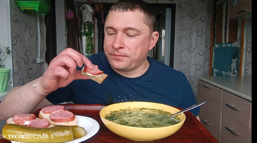 Мукбанг/обжор/суп с лапшой, бутерброды с колбасой, соленья/