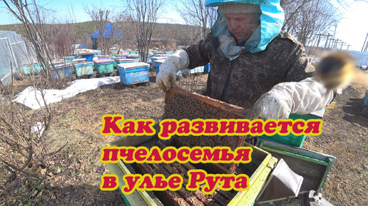 КАК СЕЙЧАС РАЗВИВАЕТСЯ ПЧЕЛОСЕМЬЯ В УЛЬЕ РУТА, ЗИМОВАВШЕЙ НА ВОЛЕ, СКОЛЬКО РАСПЛОДА И КОРМОВ.