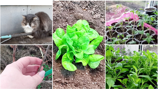 Вечерний обход растений. Без пушистого агронома никуда. Как перезимовали фуксии!? Высадила салат в теплицу.