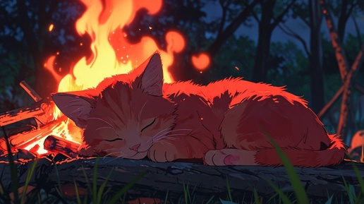 Колыбельная. Милый рыжий котенок спит возле костра. Котики