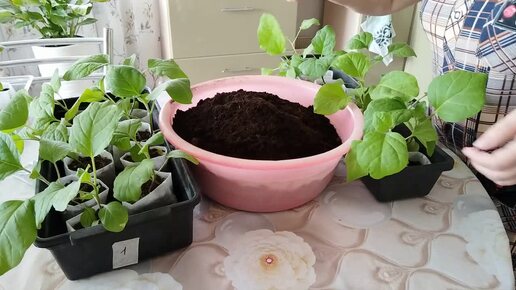 Уход за баклажанами. Подсыпаю землю, делаю подкормку. Чтобы рассада не вытягивалась и была коренастой.