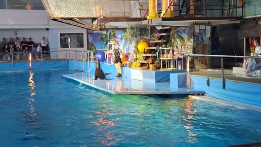 Дельфинарий. Набережные Челны. Соревнование в танцах и песнях между морским львом и детьми! Победила дружба.