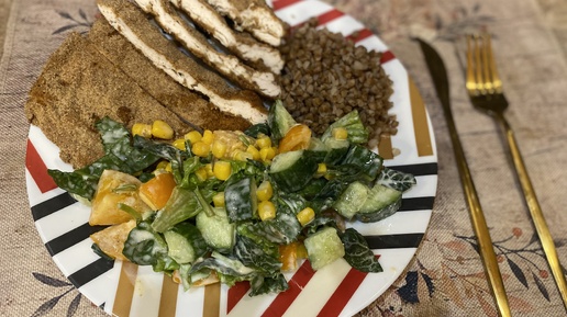 Куриная грудка в панировке с гречкой на гарнир и салатом🥗🍗