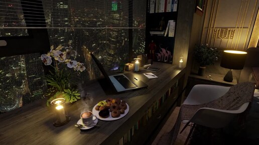 Релаксация: ночь, шум дождь в уютной комнате