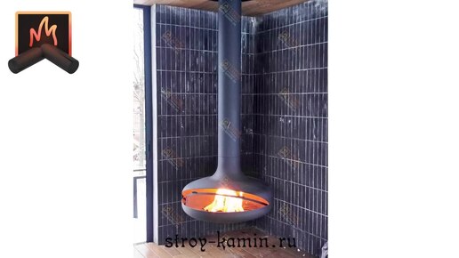 Небольшой подвесной камин Fenix Space 900, расположенный в углу террасы загородного дома