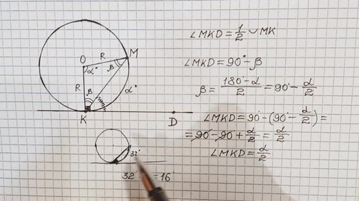 Разбираемся как найти угол между хордой и касательной, если известна величина дуги, стягиваемой хордой.