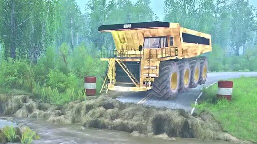 БЕЛАЗ с 8 стальными колёсами пересекает реку
