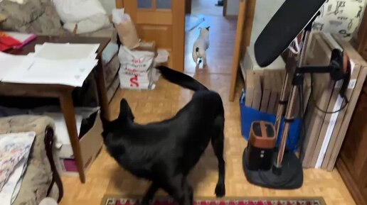 Дочка со своей овчаркой приезжала в родные пенаты. А у нас тут свой «малыш». Вот две собаки по комнатам и поносились.