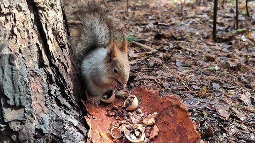 Серенькая белка поела кедряшек, запила водой