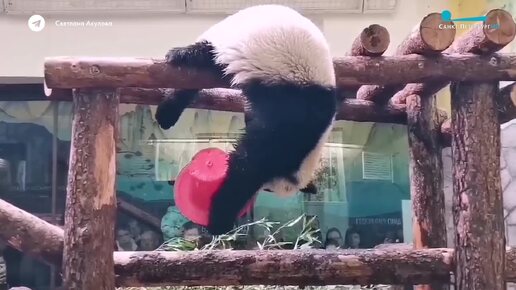 панда Катюша норовит лазать высоко, но мама-панда волнуется и стаскивает малышку вниз