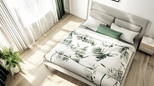 Квадратная светлая спальня в стиле минимализм с зелёными акцентами