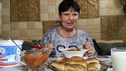 Мукбанг. Борщ с говядиной, перец Чили, блины с печенью, сметана с аджикой, молоко. 😋👍