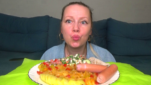 Мукбанг, сосиски, овощи тушеные, салат. еда.
