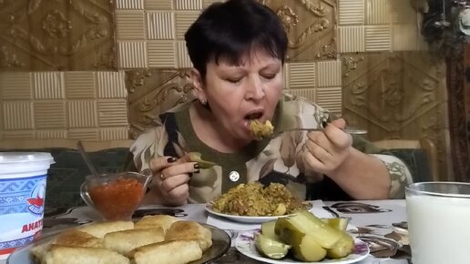 Мукбанг. Плов с кроликом, огурцы консервированные, блины с печенью, аджика, сметана, снежок. 😋👍
