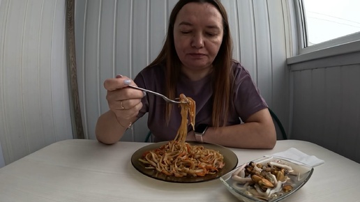 Вок с лососем, морской коктейль. Мукбанг