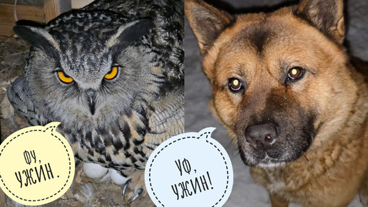 Уговариваю сову Ёль поесть, а Пёс Кубик уговаривает меня дать поесть. Дятел в коробочке делает кусь!