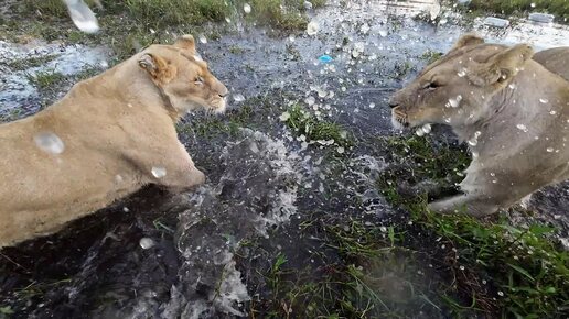 Коты плещутся в воде. Замедленная съемка.