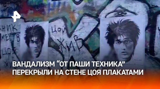 "Техник мертв, Цой жив": петербургский художник перекрыл плакатами надпись "Техник" на стене Цоя на Арбате
