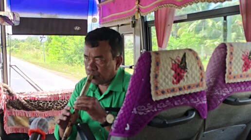 Камбоджа. Едем из Пном Пеня в парк Бокор. Наш гид Тхеави играет на флейте.