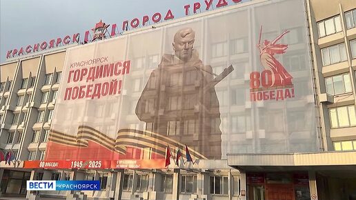 На фасаде красноярской мэрии появился баннер к 80-летию Победы