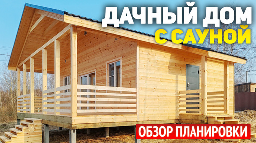 Проект каркасного дачного дома 6.5х8 с террасой и крыльцом: сауна, душевая, кухня-гостиная, 2 спальни, санузел, тамбур