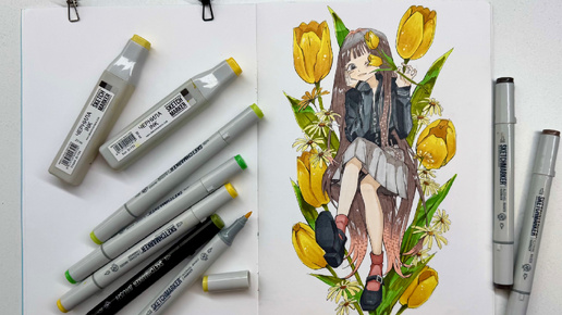 Рисуем Аниме на весеннюю тему. | Видео-урок девочка аниме с тюльпанами