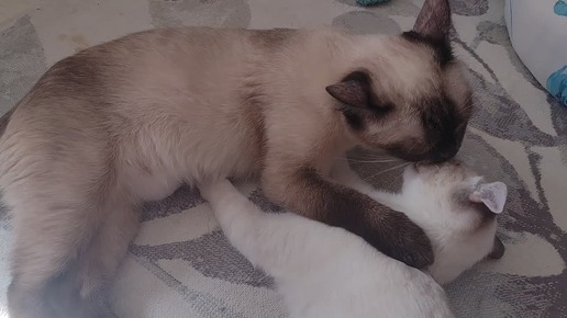 Искра присоседилась к Варе, тут дают молоко! А Варя вся высветлилась пока кормит котят