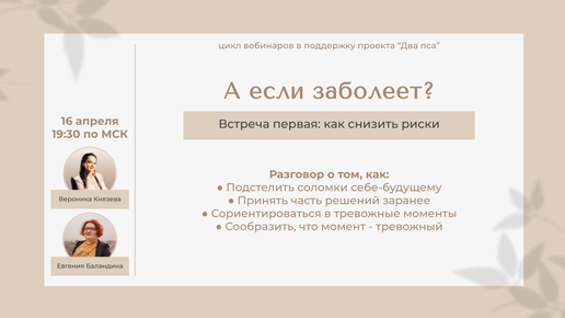 "Как снизить риски?" - первая встреча цикла вебинаров "А если заболеет?" с Вероникой Князевой и Евгенией Баландиной