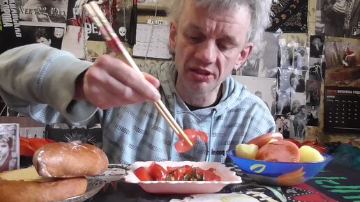 мукбанк напиток шиповник картофель отварной с чесноком с обжаренной колбасой пирожок с вишней и ватрушка с творожной массой