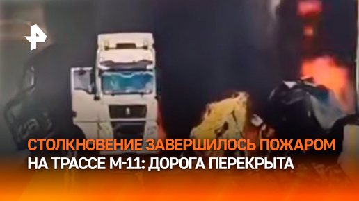 Жесткое ДТП с пожаром парализовало движение по трассе М-11: столкнулись два грузовика и авто