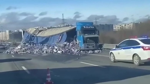 Фура рассыпала пиво по КАД в Петербурге. Движение затруднено ящиками пенного, причины ДТП неизвестны.