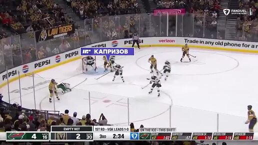 Второй гол в матче Кирилл Капризов забил снайперским броском из-за собственных ворот. 23.04.25. Вегас - Миннесота 2:5