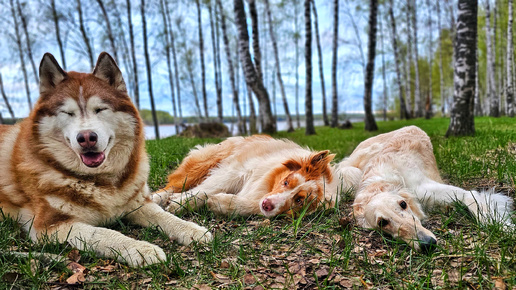 Лежим, не нарушаем! Три послушные собаченьки на прогулке учатся ждать там, где положили😅