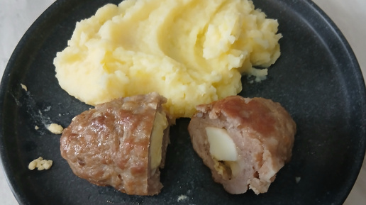 Картофель пюре с начиненными котлетами сыром и варенным яйцои