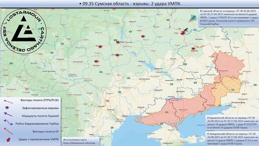 Анимированная схема ударов по территории Украины 26-27 апреля 2025 года