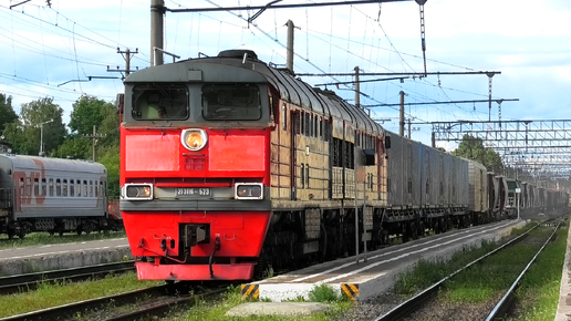 2ТЭ116-523 с грузовым поездом следует через станцию Луга-1